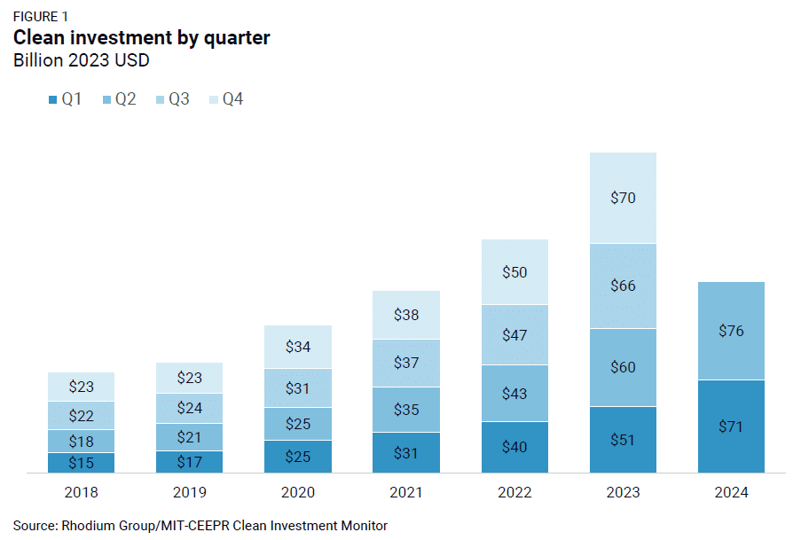 Other information from the Clean Investment Monitor tells a similar story. In the first half of 2024, companies invested $147B into clean energy manufacturing and deployment. The amount has increased dramatically each year since 2022 as companies find ways to incorporate renewables into manufacturing, energy production, and operations.